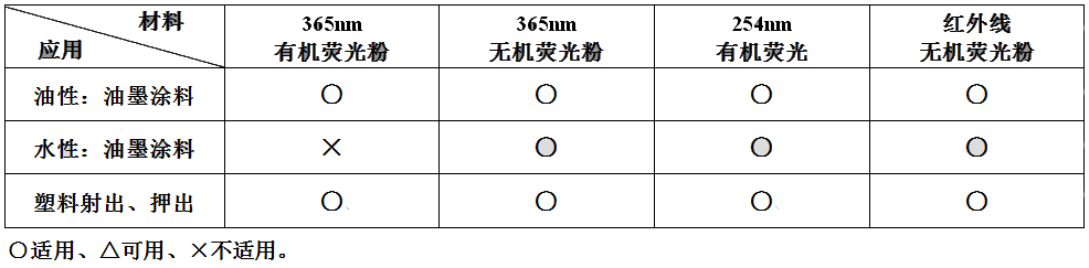 防偽熒光材料,分為a.365nm有機(染料型)4色,b.365nm無機(顏料型)5色;c.254nm有機(顏料型)7色 ; d. 254/365nm 6色 ; e. 紅外線無機材料(顏料型)6色; f. 254/365/IR 2色。
